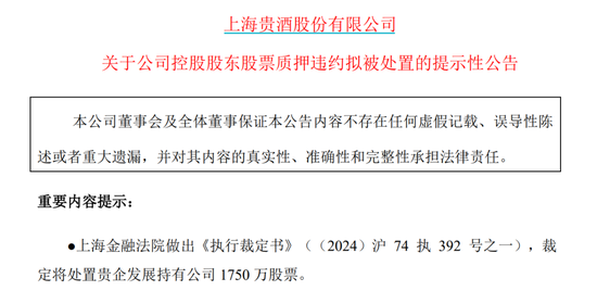 据了解,此前上海贵酒将其执有的公司1750万股票质押给天津中财交易保理有限公司(简称“中财保理”)。股票质押到期后,上海贵酒一直积极与中财保理就勤奋通过质押物置换等表情协商处置上述事项,避将就制实行,但两边最终未能结束一致。