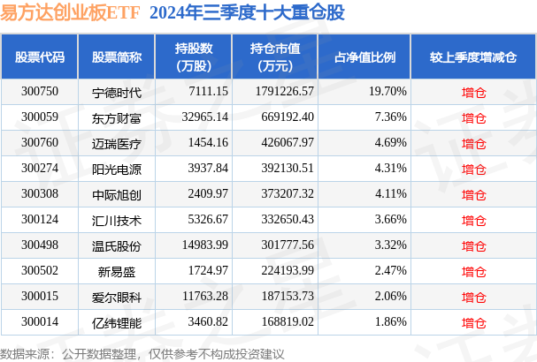 字据2024基金Q3季报公募基金重仓股数据,重仓该股的公募基金共175家,其中抓独特量最多的公募基金为易方达创业板ETF。易方达创业板ETF当今边界为909.02亿元,最新净值1.9715(1月9日),较上一往翌日上升0.11%,近一年上升15.61%。该公募基金现任基金司理为成曦刘树荣。成曦在职的基金居品包括:易方达深证100ETF荟萃A,处理技巧为2016年5月7日于今,技巧收益率为43.26%;易方达创业板ETF荟萃A,处理技巧为2016年5月7日于今,技巧收益率为-3.03%;易方达深证100ETF,处理技巧为2016年5月7日于今,技巧收益率为38.11%;刘树荣在职的基金居品包括:易方达深证100ETF荟萃A,处理技巧为2017年7月18日于今,技巧收益率为23.88%;易方达创业板ETF荟萃A,处理技巧为2017年7月18日于今,技巧收益率为20.39%;易方达深证100ETF,处理技巧为2017年7月18日于今,技巧收益率为21.93%;